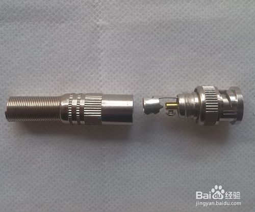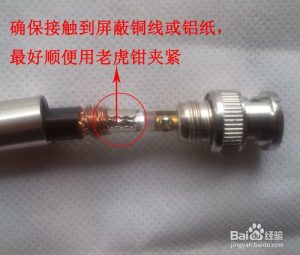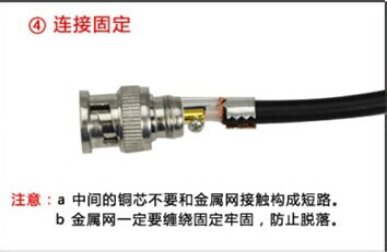 3、裝配BNC 接頭:連接好芯線后,先將屏蔽金屬套筒套入同軸電纜,再將芯線插針從BNC 接頭本體尾部孔中向前插入,使芯線插針從前端向外仲出,最后將金屬套簡前推,使套簡將外層金屬屏蔽線卡在BNC 接頭本體尾部的圓柱體;